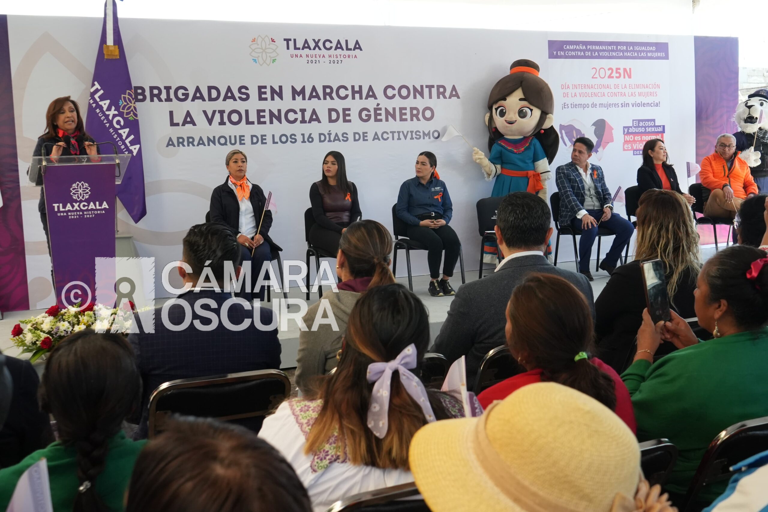 La gobernadora Lorena Cuéllar Cisneros encabezó la caminata realizada en San Francisco Tetlanohcan en el marcó del arranque del programa estatal de 16 días de activismo contra la violencia.