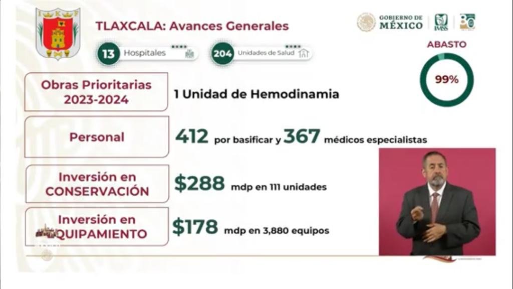 Se informó que en Tlaxcala se han contratado 367 médicos especialistas a través de IMSS-Bienestar. Además, se ha invertido un total de 466 millones de pesos, con 288 millones destinados a la rehabilitación de 111 Unidades Médicas y 178 millones de pesos invertidos en la adquisición de 3,880 equipos médicos.